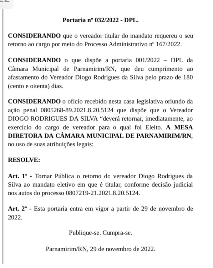 CONSIDERANDO o que dispõe a portaria 001/2022 – DPL da Câmara Municipal de Parnamirim/RN, que deu cumprimento ao afastamento do Vereador Diogo Rodrigues da Silva pelo prazo de 180 (cento e oitenta) dias.